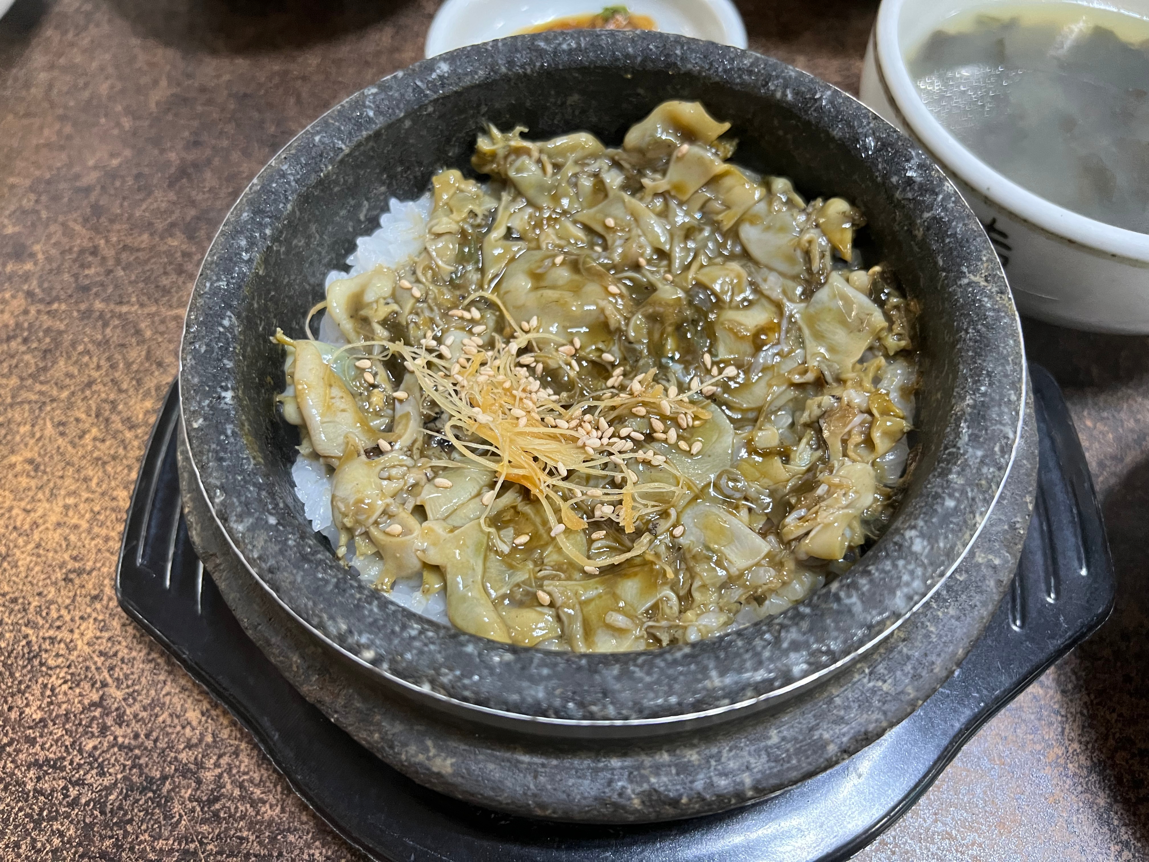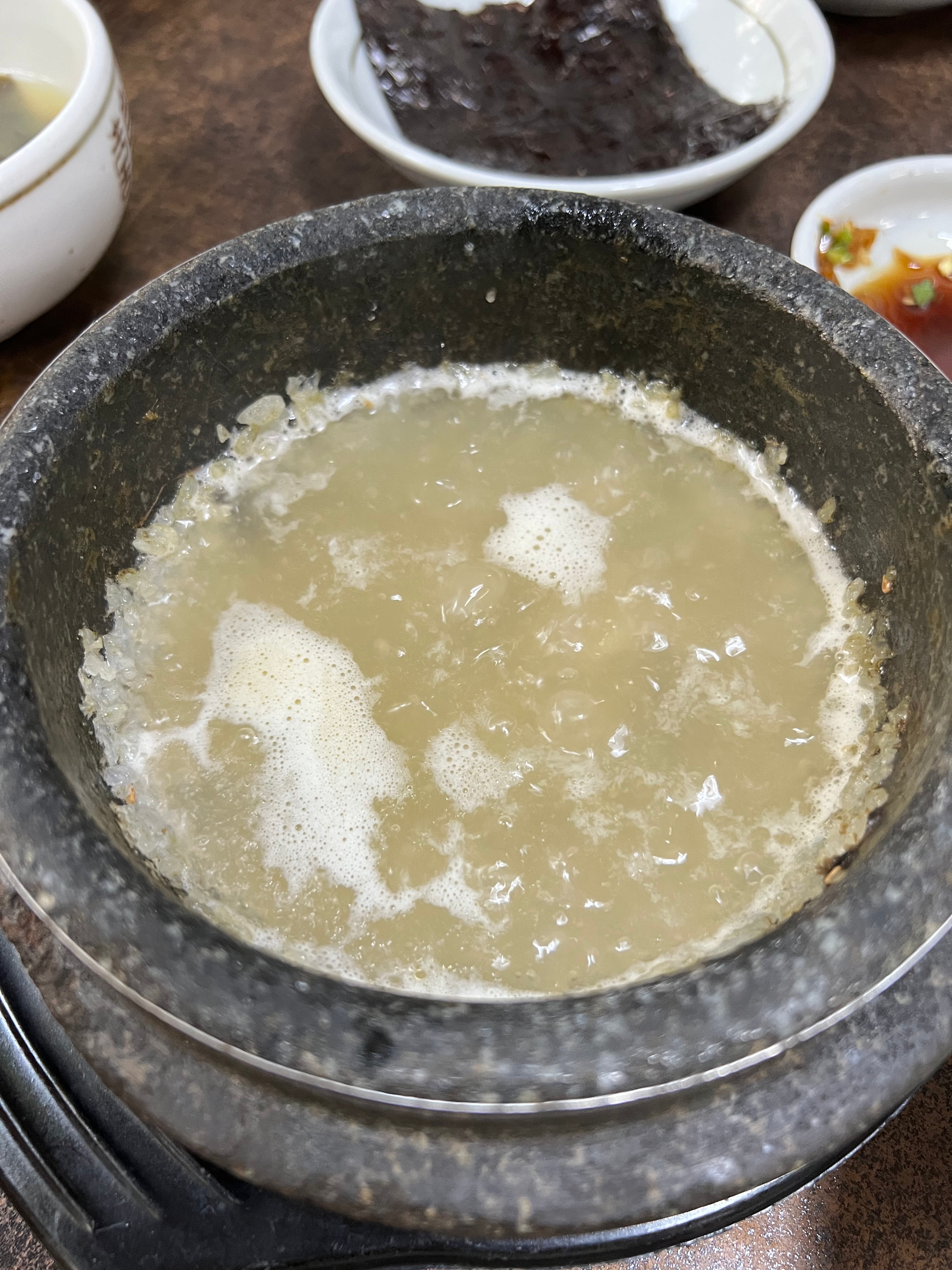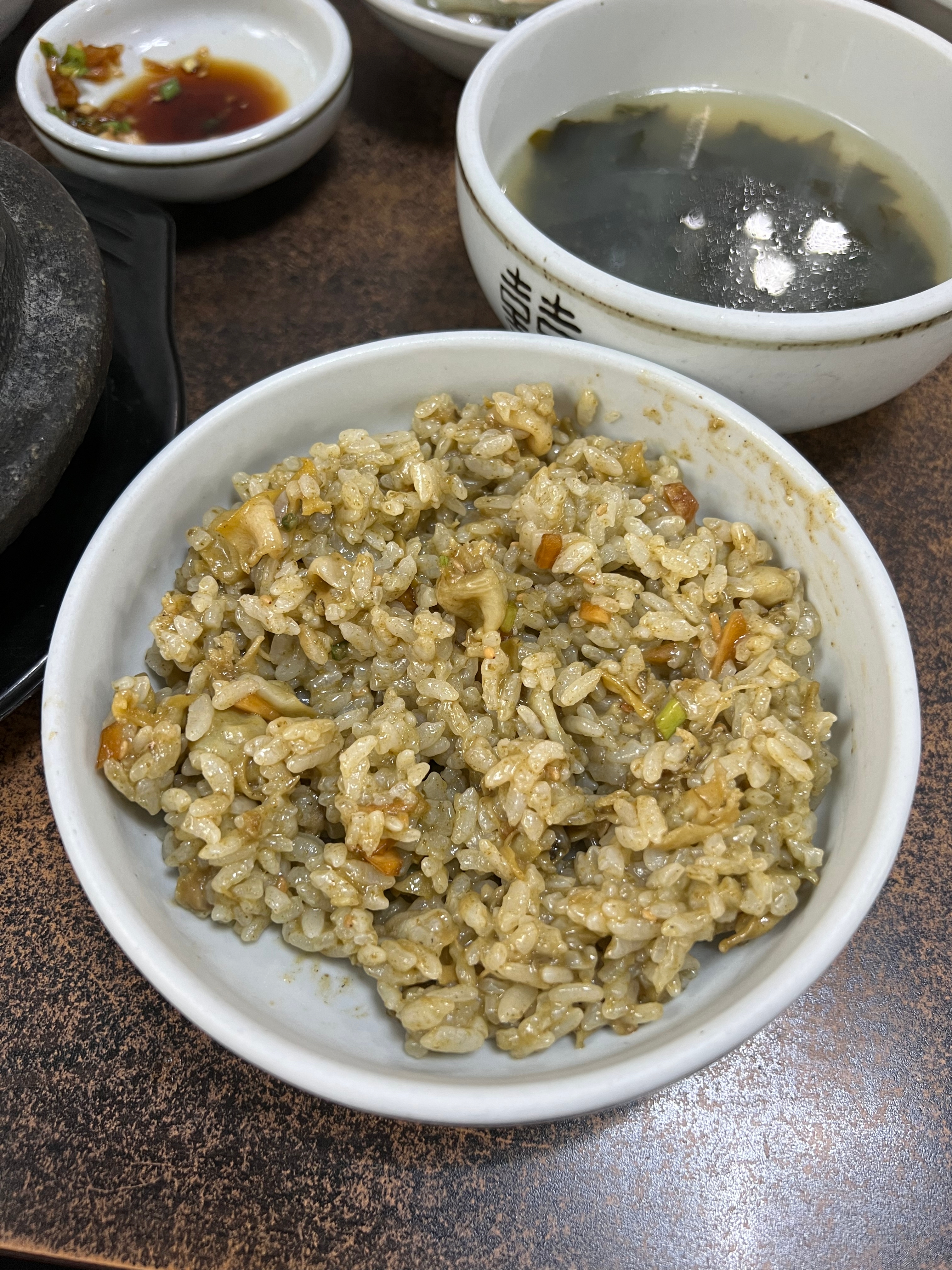 돌솥밥이 나왔습니다. 생각하셨던 그림인가요? 저는 처음에 뚜껑 열고 많이 놀랐습니다. 아니 이게 뭐야. 뭐지. 안 익은 건가. 이게 뭘까 하는 생각들이 났습니다. 하지만 향이 장난이 아닙니다. 침이 넘어가는 게... 아주 못 참겠더라고요!!!