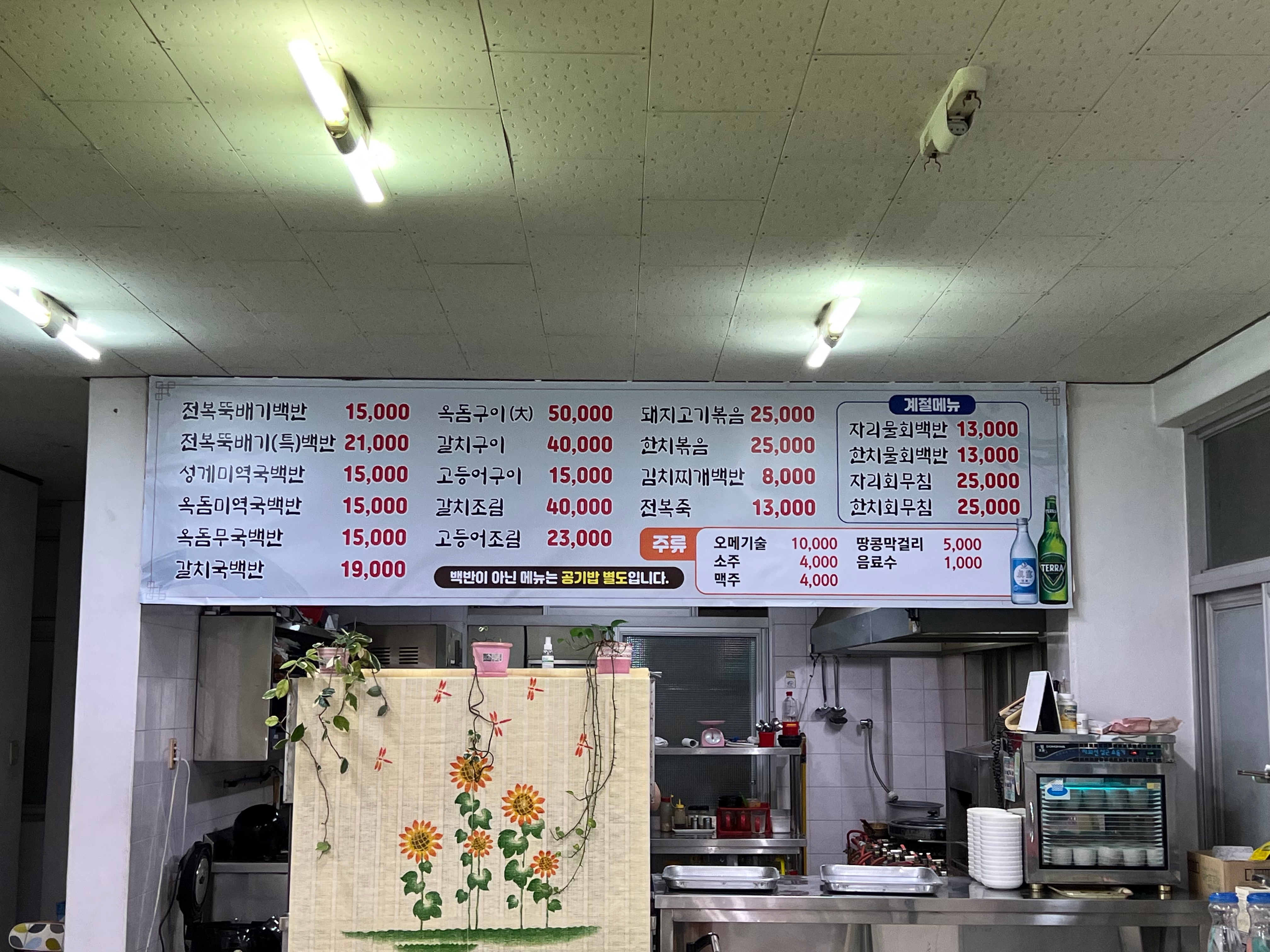 그리고 계절메뉴로 자리물회백반 13,000원, 한치물회백반 13,000원, 자리회무침 25,000원, 한치회무침 25,000원에 판매하고 있습니다.