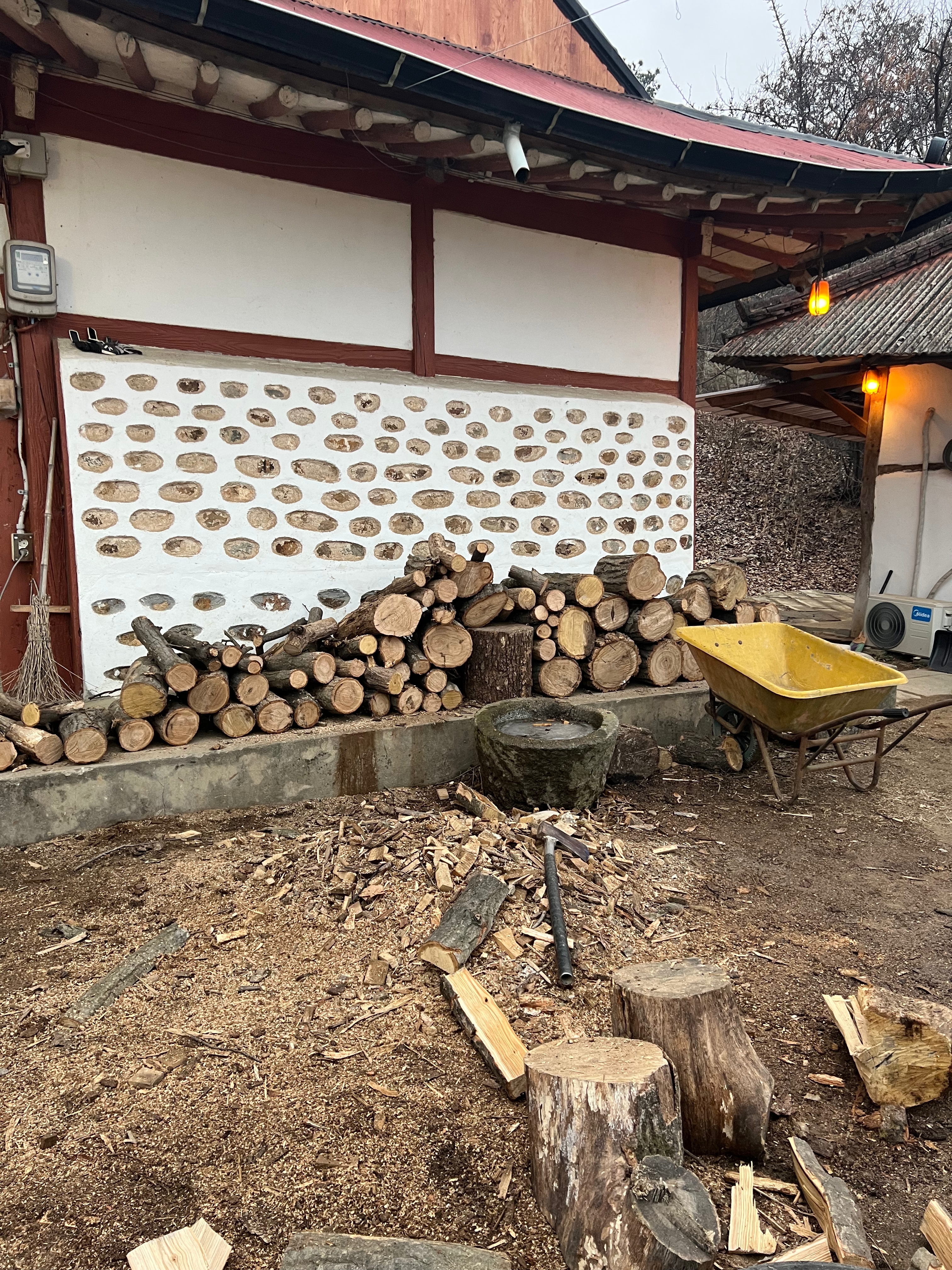 조금 늦게 도착했더니 친구들은 이미 장작을 했고, 불도 붙이고 있었습니다. 이곳은 장작을 구매해 올 필요가 없습니다. 다만 셀프로 장작을 쪼개야 합니다. 재미있는 경험이었습니다. 하지만 나무가 튀어서 친구는 다리를 그만... 그리고 전날에 비는 아니지만 습한 날이었기에 장작이 젖어서 연기도 많이 나고 불멍이 조금 많이 힘들었습니다. 불멍은 잘 마른 좋은 장작을 태울 때 나는 소리와 향기, 불빛이 진짜입니다. 불멍을 좋아하신다면 따로 장작을 좀 구해가시는 것을 추천드립니다. 편하게 때우기에는 좋지만 외부 보관이다 보니 장작의 퀄리티는 떨어지는 편이었습니다.